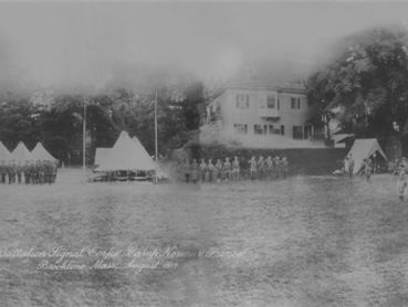Above Left: The 101st Field Signal Battalion Corps set up in camp near Dummer Street in 1917. (Brookline Historical Society)